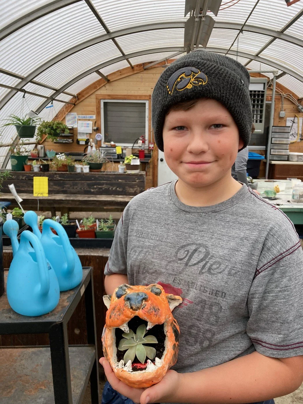 Seventh and eighth grade Studio Art students used basic forms to build 3D animal clay planters, using a variety of hand building techniques. After several weeks of building and glazing their artworks students took a field trip to our Green House. Abbie Castriotta, our Garden/Greenhouse Manager, taught students how to propagate, plant, and care for a plant of their choice.