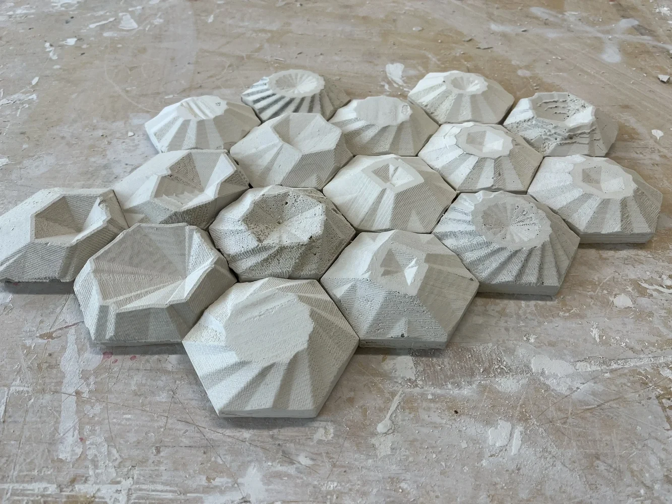 This semester High School students in the Innovation lab are working on a project entitled 'Cast and Pattern'. Students are building prototypes of hexagonal wall tile systems. We are in the midst of the casting process, but to get there students had to learn how to digitally model and cnc mill their molds. Along the way we have talked about casting at the scale of Architecture and learned about polygonal geometry. The students have learned to laser cut, cnc mill, digital model and use a variety of hand tools. It has been a lot of fun and the students have built some beautiful objects. When we are done we have collectively made over 100 tiles.
