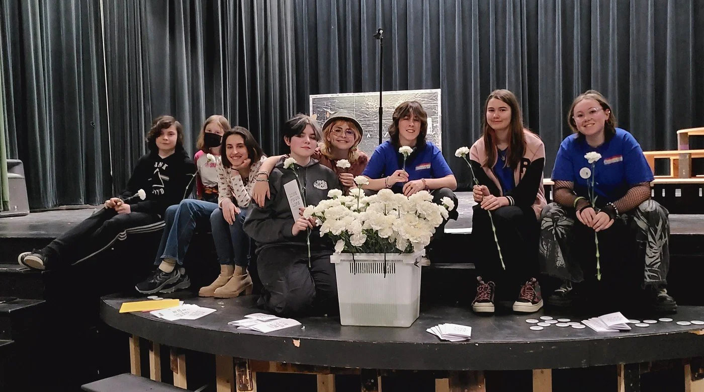 WUMS QSA students put hours of time and energy into a program they developed called, "Live Your Life". Big goal: To increase empathy and promote positive social interaction in our middle school by helping people get to know each other’s stories. They led a presentation each day during Connections Time this week to address tough topics with group activities. Students in the 7th and 8th grade were mixed into 7 different groups. They also designed and made buttons and a resource brochure. The Woodstock Inn supported our group by helping with the costs of white carnation flowers that were offered at the end of an assembly presentation to students. Three other important middle school QSA members were absent for the group picture.