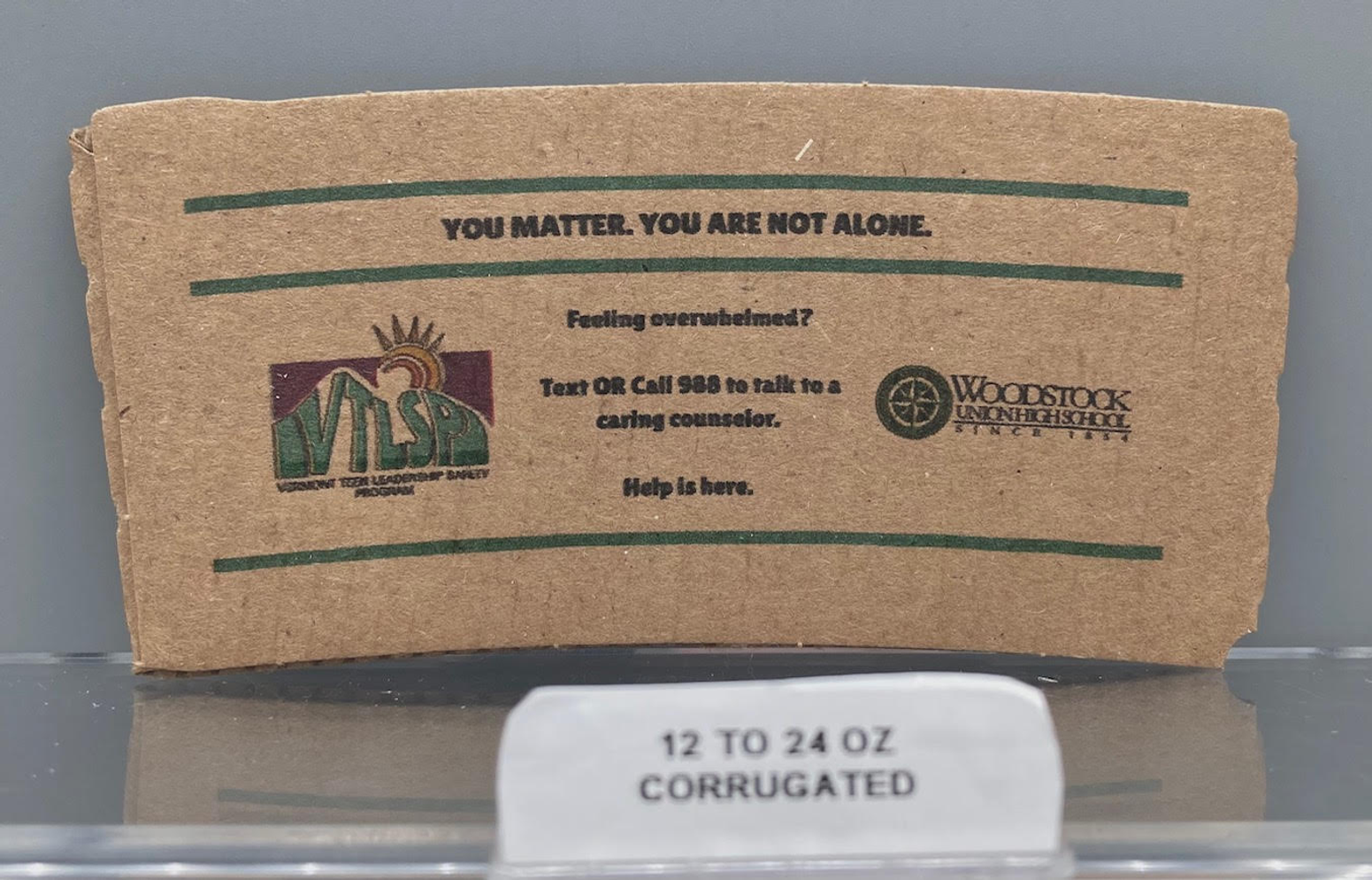 Co-president Aleks Cirovic of VTLSP (Vermont Teen Leadership Safety Program) designed this coffee sleeve that addresses suicide prevention and promoting the 988 number. We bought a case of these printed coffee sleeves and local establishments welcomed a box for their customers. Local managers expressed their support for such a mission and thought it was a job well done. Stores welcoming these coffee sleeves were: The Barnard General Store, Maplefields, Cumberland Farms, Mon Vert Cafe, The Village Butcher, Teago General Store, Swiss Farm Market in Pittsfield, Abracadabra Coffee Company and The Woodstock Farmers' Market. These sleeves are also biodegradable. Members of VTLSP would like to thank these stores for their ongoing support for the students of WUHSMS and VTLSP.